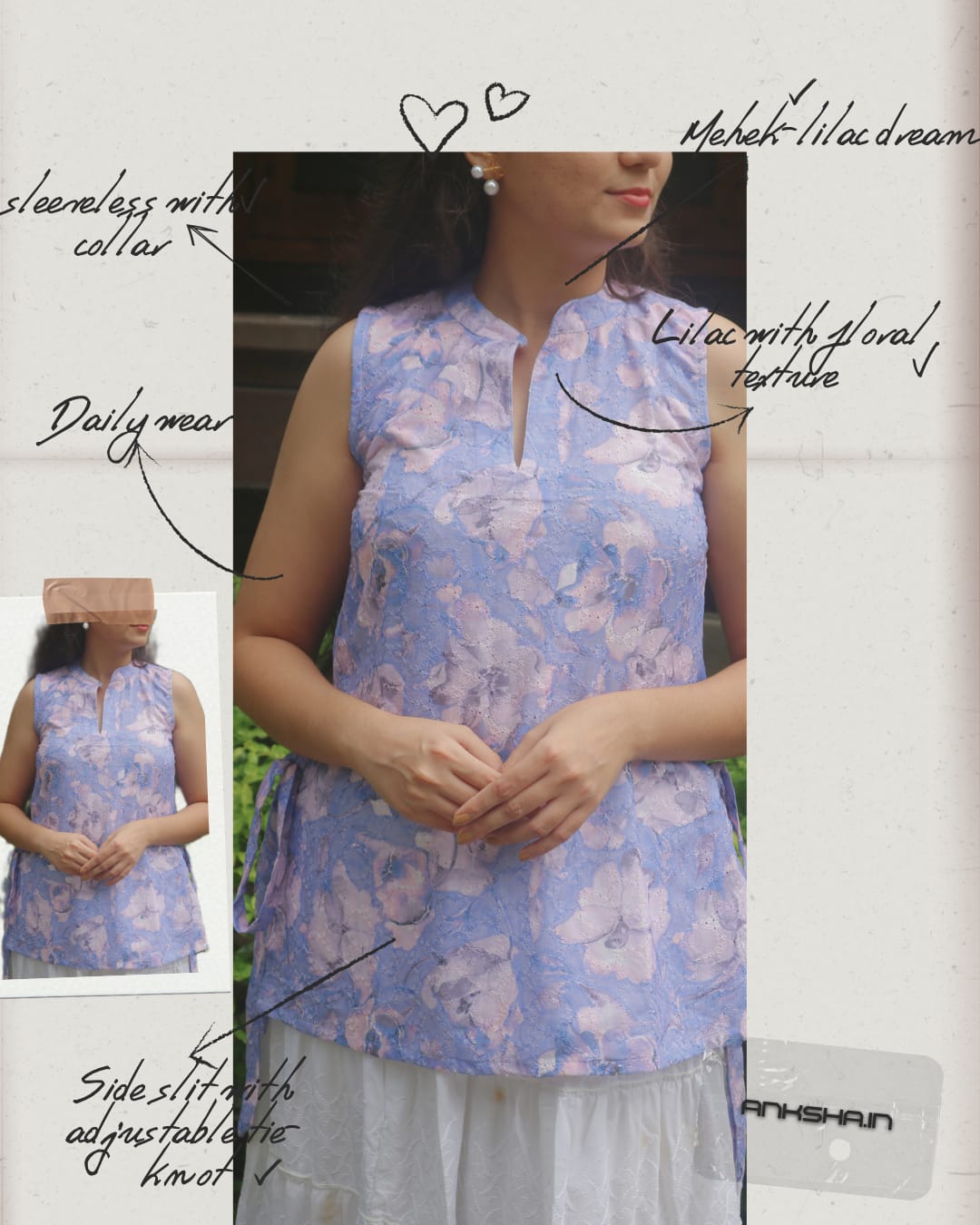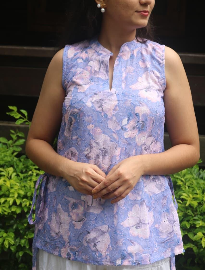 A breezy everyday cotton top designed for comfort and elegance. The sleeveless silhouette with a neat collar and side tie-knot detail makes it versatile for both casual and semi-formal looks. Crafted in soft cotton, this top is lightweight, breathable, and perfect for daily wear.