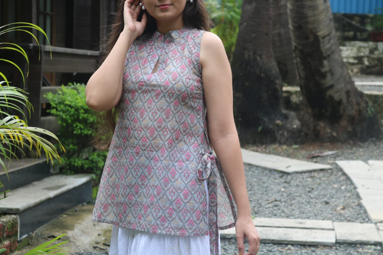 A graceful cotton top with a subtle charm of rose-pink motifs on a soothing grey base. The sleeveless cut, neat collar, and side tie-knot make it a perfect everyday wear piece that blends comfort with elegance. Light and breathable, it’s ideal for daily styling with skirts, pants, or palazzos.